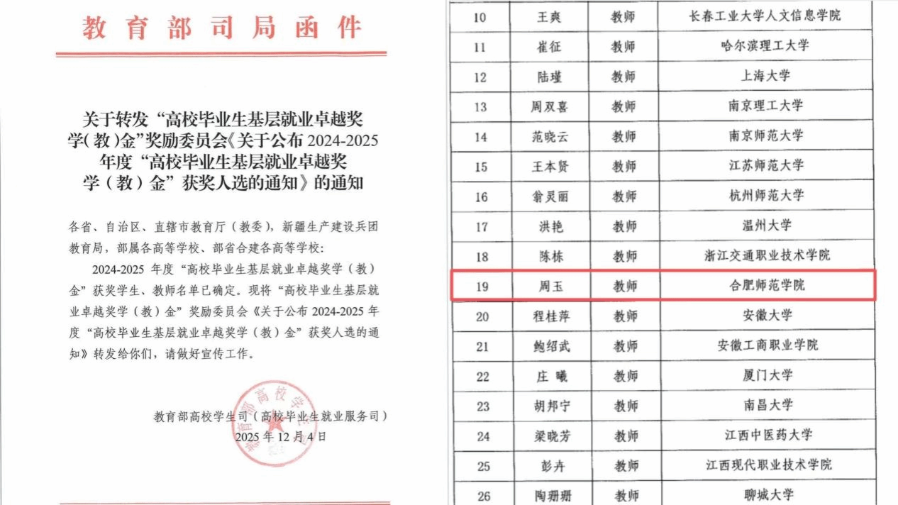 近日,教育部2024—2025年度“高校毕业生基层就业卓越奖学(教)金”评选结果揭晓,我院辅导员周玉凭借...