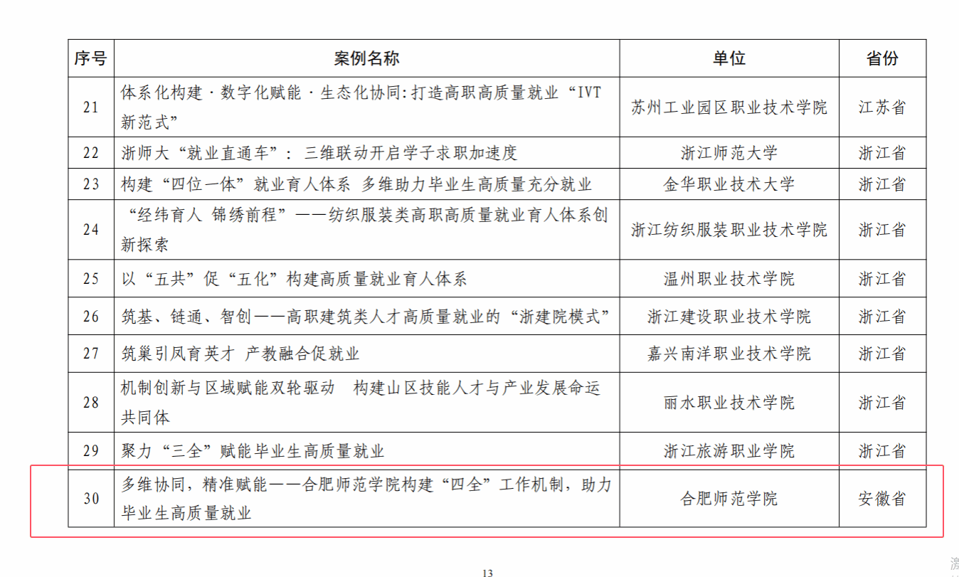 近日,学校就业工作案例《多维协同,精准赋能一一合肥师范学院构建“四全”工作机制,助力毕业生高质量就业》经自主申报、资格审查、专家评议、社会公示并报协会批准等环节,成功入选高校毕业生就业协会2025届毕业生就业创业工作典型案例。