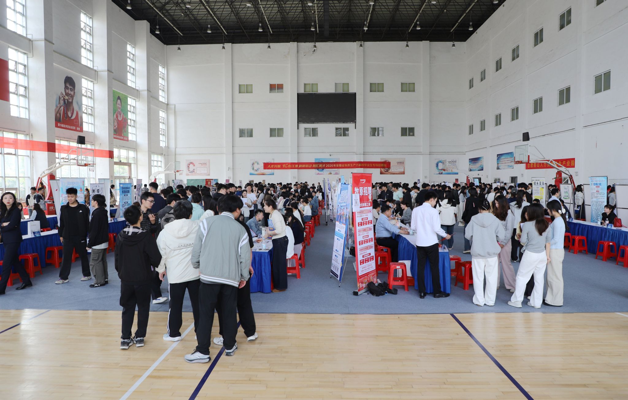为深入贯彻落实习近平总书记关于高校毕业生就业工作的重要指示批示精神,紧扣安徽省“人才兴皖”战略部署,精准对接新质生产力发展核心需求,搭建新质生产力领域优质用人单位与高校毕业生的精准对接桥梁,助力毕业生投身新质生产力相关产业实现高质量充分就业,4月17日下午,由安徽省教育厅主办,合肥师范学院联合宣城市公共就业服务中心,合肥经济技术开发区人力资源中心、蜀山区人力资源和社会保障局、临湖社区,阜阳市颍东区人力资源和社会保障局、安徽省人工智能协会共同承办的“人才兴皖‘就’在江淮”——2026年安徽省新质生产力高校毕业生专场招聘会,在锦绣校区体育馆顺利举办。
